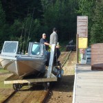The rail portage is truly a unique experience for all boaters. A rail cart and track system stretch between Whitesail and Eutsuk Lakes. It is approximately 350 m in length and takes about 30 minutes to cross with the assistance of the park facility operator. The cart will easily handle boats up to 26 feet long with an 8 1/2 foot beam. Some larger boats can be transported but you should contact us for more information. There are winching and park fees payable at the portage. The park fee is $50 per boat for a 14 day stay. Winching fees are $50 per boat each way. The park facility operator is on site from June 15 to September 7. The portage is open prior to June 15 and after September 7 but you will need to hand Winch yourself across.